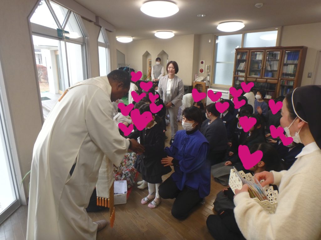 今回が子ども達とは初めましての神父様のお話を聴いてクリスマスの意味を教わったり、「神様のお話」で今年一年、お世話になったシスターやアソシエイツの方々からプレゼントを頂戴したり。