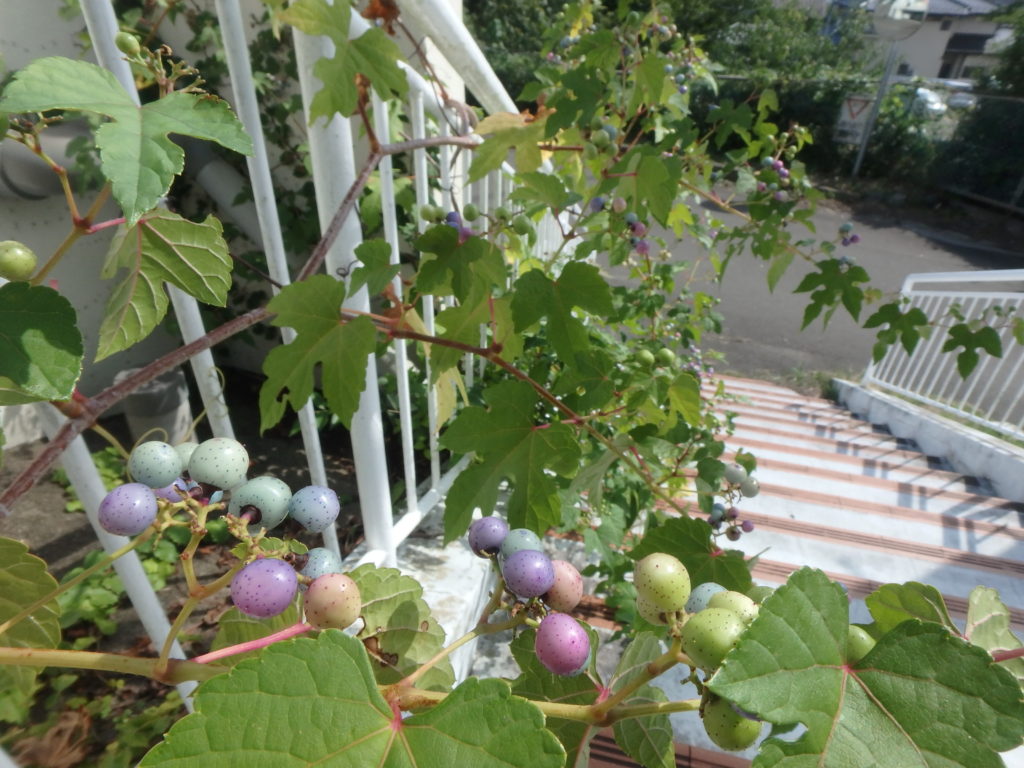 実色のグラデーションがきれいな野ブドウ。日に日に色づきが濃くなります。