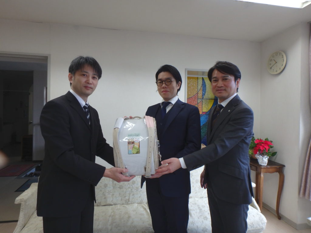 今日は遠く東京、北海道からお越しくださいましたマニュライフ生命様より、ランドセルの贈呈を受けました。しっかりした作りでとてもかわいらしい色の素敵なランドセルです。